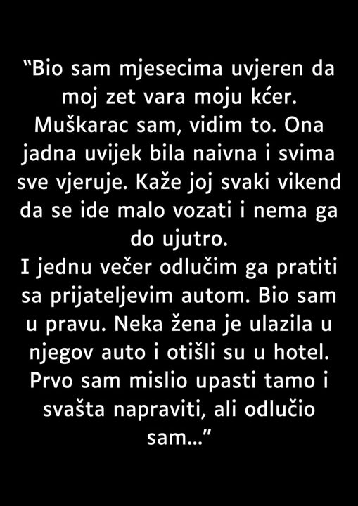 - Sve je počelo sitnicama. Zet bi često kasnio, ponekad bi bio odsutan mislima, a telefon mu je gotovo uvijek bio u ruci. Otac je sve to posmatrao izdaleka, bez riječi, ali s rastućom nelagodom. Svaka nova situacija u njegovim očima je potvrđivala ono čega se bojao. Uvjerio je sebe da vidi ono što drugi ne vide i da je jedini koji brine za istinu.