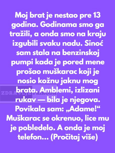 Dok sam stajala na pumpi, pored mene je prošao muškarac. Nosio je kožnu jaknu. Na prvu nisam pomislila na ništa, ali onda sam pogledala bolje. Ambeli su bili isti kao oni koje je nosio moj brat. Izlizani rukavi, isti stil. Odjednom mi je srce poskočilo. Zadrhtala sam. Osećaj je bio neopisiv. Moje telo je bilo potpuno obuzeto emocijama, a onda nisam mogla da zadržim glas. Povikala sam: „Adame!“
