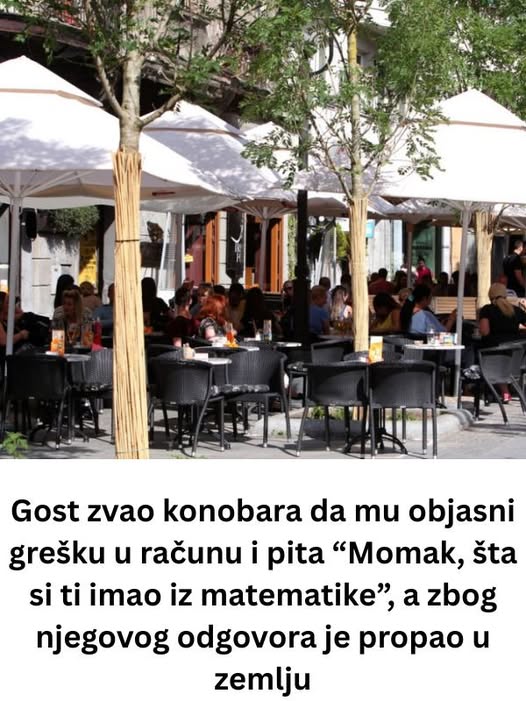 Za stolom, mladić, koji se odlikuje modernom odjećom i visokim samopouzdanjem, doziva konobara i pita ga: “Šta si ti studirao, matematiku?”. Ova pitanja nisu samo obično zanimanje za nečiji obrazovni put, već prikrivena poruka u kojoj se, uz osmijeh, jasno stavlja do znanja ko je “gore”, a ko “dolje”. Konobar, koji s puno strpljenja i mirnoće odgovara da je završio Mašinski fakultet, ostavlja gostu da se zapita – da li je njegovo “ti” stvarno znak bliskosti, ili tek oblik potcjenjivanja?