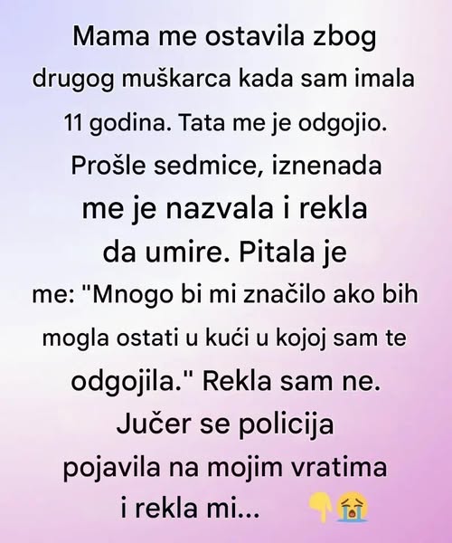 Juče, dogodilo se nešto što nikada nisam želela da saznam. Policija se pojavila na mojim vratima. Nikada nisam zamišljala da će to biti način na koji će se sve završiti. Bili su tu sa nekim dokumentima, sa informacijama koje nisam očekivala. Mama je umrla. Nije preživela. Ali nije to bila samo smrt – bila je to smrt nečega što sam smatrala izgubljenim zauvek, smrt odnosa koji nikada nije bio ispravljen, smrt veze koja je ostala razdvojena godinama.