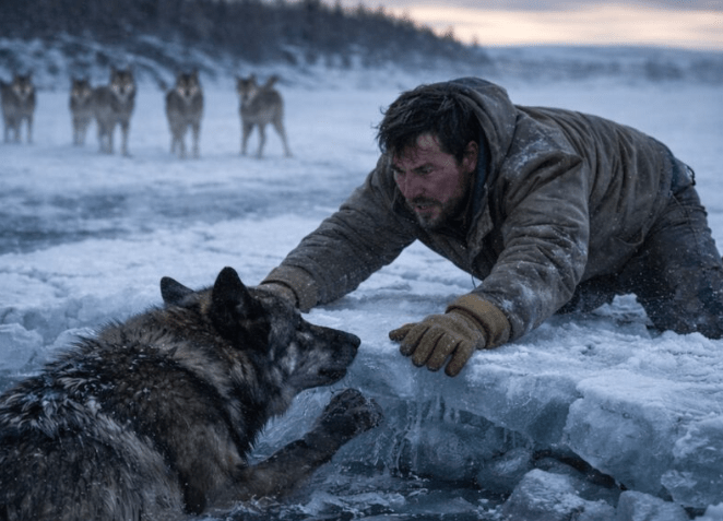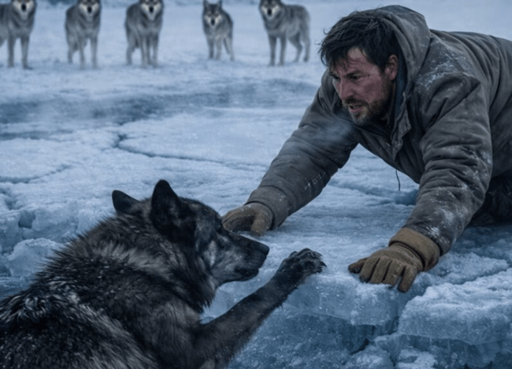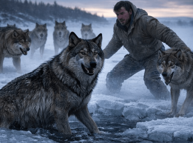 Ono što je video na ledu zapanjilo ga je i nateralo da zastane. Na površini zaleđenog jezera, velika vučica, trudna, borila se sa ledenom vodom. Pokreti su joj bili oštri, očajnički. Njene šape su klizile po ivici leda, a svaki put kad bi pokušala da se popne, padala je nazad u vodu. Voda oko nje je postajala sve tamnija jer je njena dlaka prekrivala led. Iz njenog grla su dolazili slomljeni, gotovo ljudski krikovi. Borila se, ali nije imala snage da se izvuče.