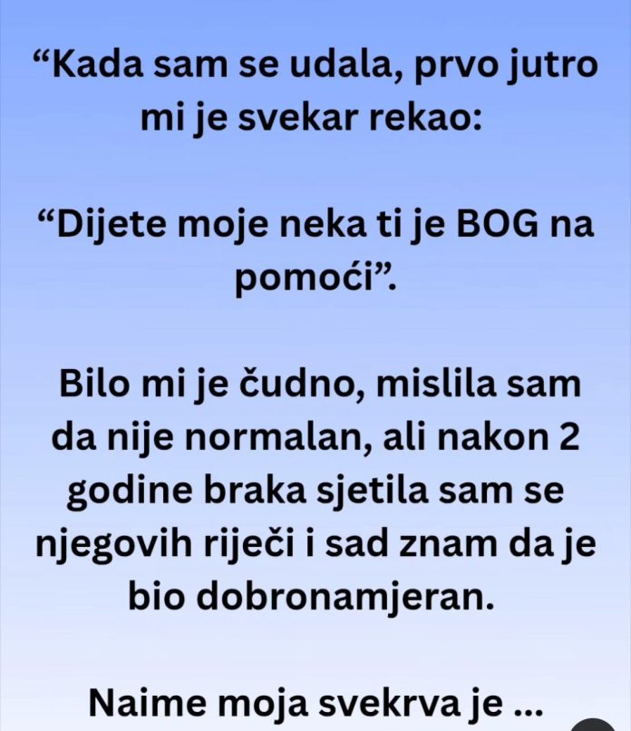Ipak, već prvog jutra nakon vjenčanja čula je rečenicu koja joj se zauvijek urezala u sjećanje. Svekar, tih i blag čovjek, rekao joj je: „Dijete moje, neka ti je Bog na pomoći.“ Mislila je da se šali, možda da želi razbiti tremu, ali nije znala da su to bile riječi upozorenja – tiha istina čovjeka koji je već znao s kim dijeli krov.