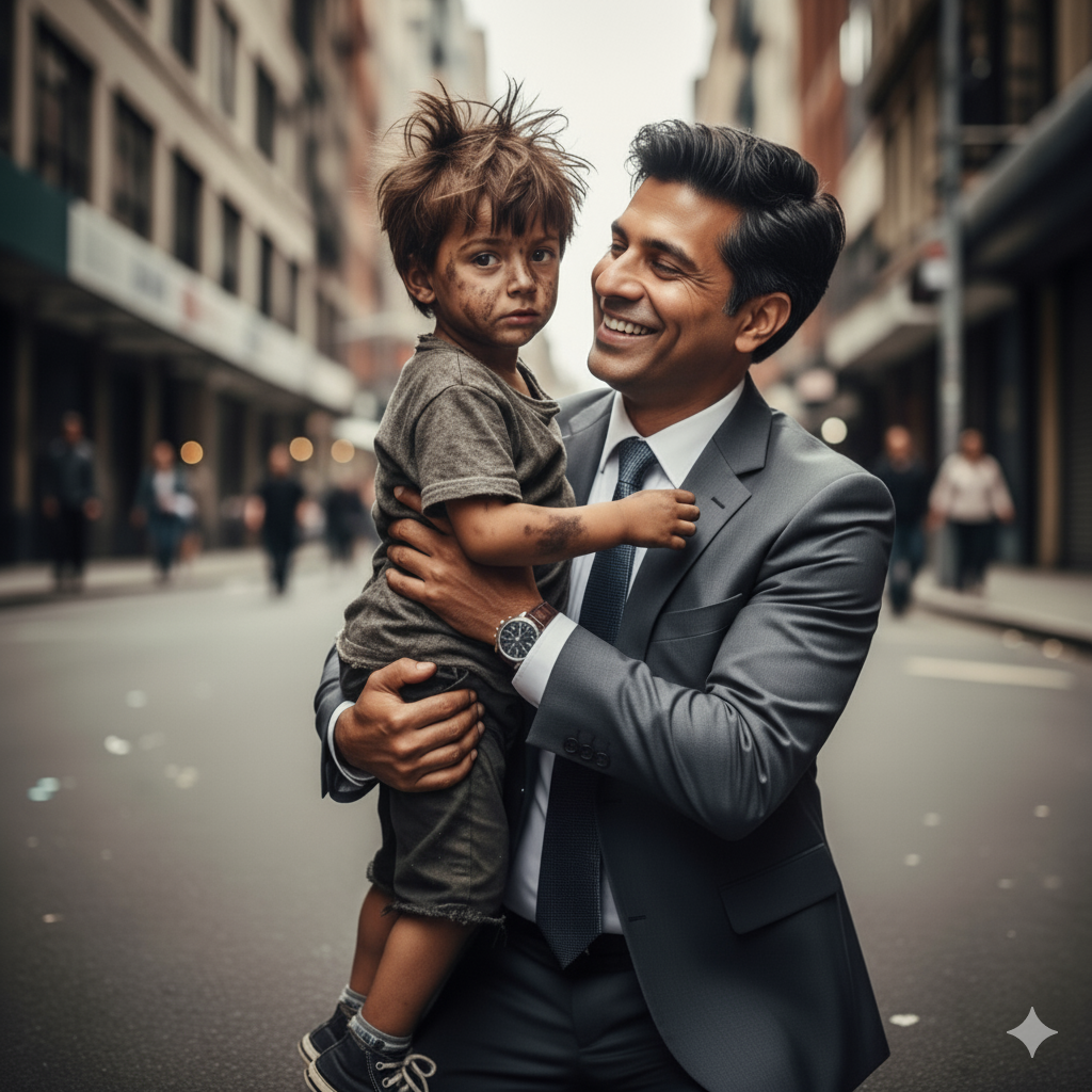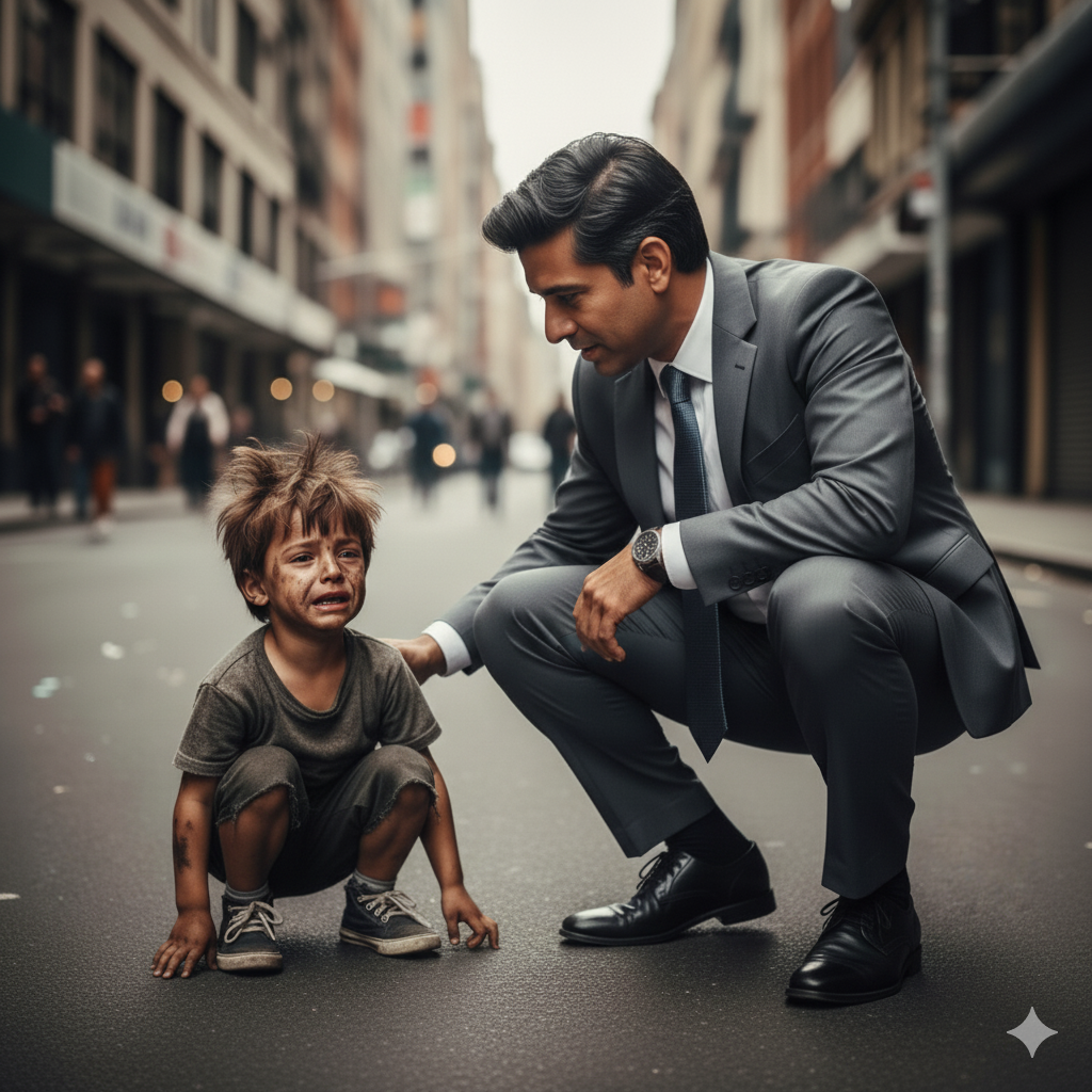 Jednog hladnog popodneva, dok je izlazio iz auta i žurio po kavu prije nego pokupi Ethana iz škole, David je ugledao nešto što ga je nagnalo da zastane. Na ivici pločnika sjedio je dečak, u poderanoj majici i prljavim patikama, glave pognute ka asfaltu. David je prišao i pitao tiho: “Jesi li dobro?” Dečak je jedva podigao pogled i rekao: “Dobro sam.” Njegov glas bio je tih, krhak. David je ponudio hranu, ali dečak je odmahnuo glavom. “Šta ti onda treba?” pitao je David, iznenađen odgovorom. Dečak je spustio pogled na fotografiju malog Ethana koju je David držao u ruci i prošaputao: “Ne treba mi novac. Samo da me neko zagrli… kao tvog sina.”