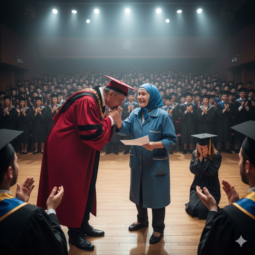 Tada je dekan iznenada prekinuo ceremoniju. Stao je ispred svih i rekao da diplome koje studenti drže nisu samo simboli uspjeha, već odražavaju i one koji su žrtvovali mnogo kako bi ih postigli. I umjesto da nastavi, dekan je sišao s pozornice i krenuo prema stražnjem dijelu dvorane, gdje je stajala Lucija, u svojoj izblijedjeloj radnoj kuti, s metlom u ruci. Došla je da samo izdaleka pogleda svoju kćerku.