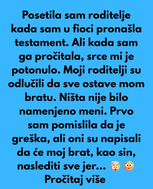 Dok sam prolazila kroz hodnik i tražila torbu, primetila sam nešto neuobičajeno. Fioka u dnevnoj sobi, koja je uvek bila zatvorena, bila je blago otvorena. Zamišljeno sam prišla i, znajući da nikada nisu voljeli da ostavljaju stvari u neredu, povukla fioku prema sebi. Unutra, između starih papira i privatnih dokumenta, stajao je – testament. Moji roditelji nikada nisu pričali o tom dokumentu. Zamišljala sam ga kao nešto što ostavljaju za kasnije, kad dođe vreme. Ali to što sam pronašla nije bilo ništa što sam očekivala.