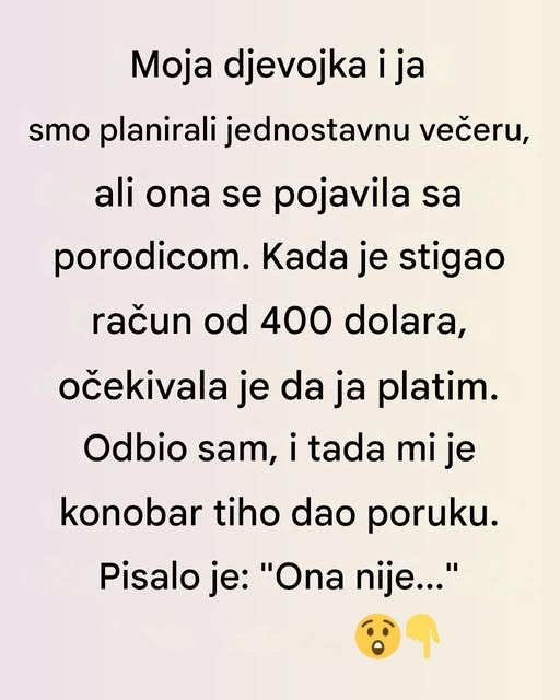 Tada je usledila tih poruka – konobar, koji je došao do mog stola, tiho je prošaptao poruku koja je promenila sve. On je, zapravo, znao nešto što nisam. Poruka koju mi je napisao na papiriću bila je jasna: „Ona nije…“