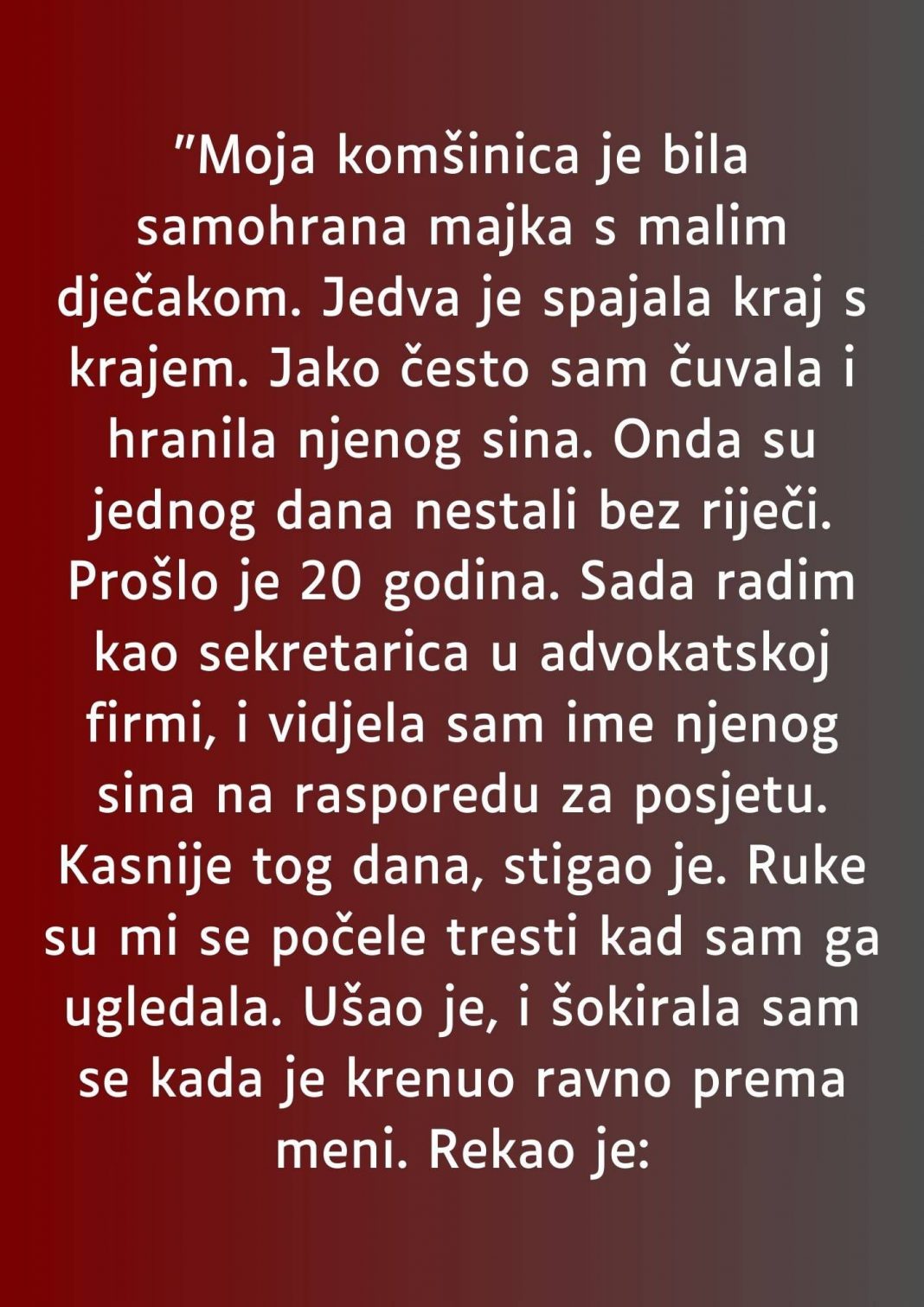 - Nekako, vremenom, počele smo više razgovarati. Njene priče su bile jednostavne, ali snažne. Svaka priča bila je kao nauk. Nikada nije dozvolila da je život stavi na kolena, a njena snaga bila je u njenoj odlučnosti. Bila je majka koja je sve činila sa ljubavlju, bez obzira na umor, bez obzira na teškoće. I svaki dan je išla napred, sa samo jednim ciljem – da njen sin bude srećan i zdrav.