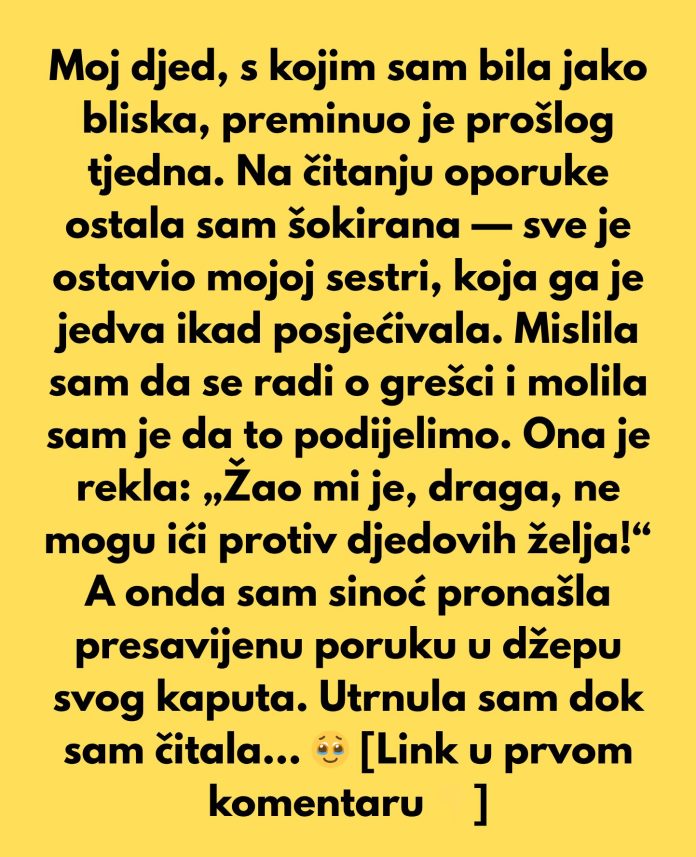 Nakon njegove smrti, svi smo očekivali da će nasljedstvo biti podijeljeno ravnopravno, jer je to bio njegov testament. I vjerovala sam da će moja sestra, kao starija i razumnija, poštovati volju djedovih riječi. No, ispostavilo se da su pohlepa i novac promijenili njen pogled na sve.