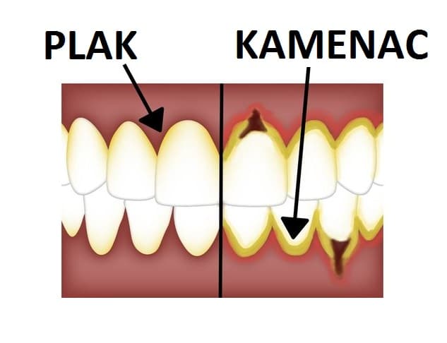 Zubni kamenac nastaje kad plak, sloj bakterija i ostataka hrane, ne bude uklonjen redovnim pranjem zuba.