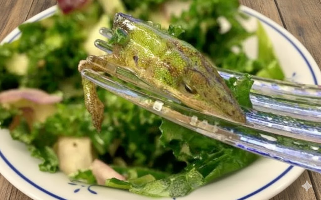 Na vrhu viljuške, umesto komadića povrća, nalazila se mala, zeleni stvor. Polako je pogledala i shvatila da je to žaba. Mala, skvrčena, sa zelenim kožama, bila je tamo, tačno između komadića salate. Marina je zastala, srce joj je brže otkucalo, i shvatila da nešto nije u redu. U njenoj salati, umesto sočnog paradajza ili krastavca, na vrhu viljuške bila je žaba!