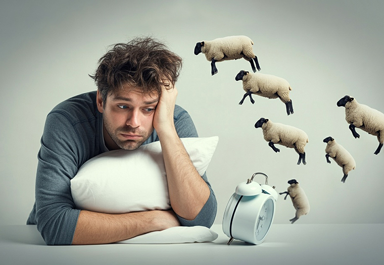 Insomnia. Tired man with pillow checking time on light grey background. of sheep jumping over alarm clock