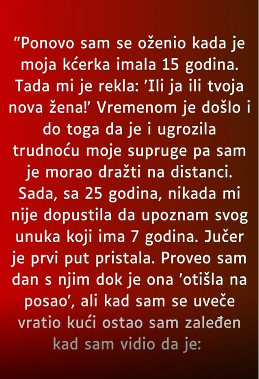 Prošlo je sedam godina. Sedam dugih godina bez ijednog susreta, bez zagrljaja, bez riječi. A onda, iznenada, stigla je poruka. Kratka, suha, ali dovoljna da mu srce zatreperi. Pristala je da vidi unuka. Samo jedan dan. Bez pitanja, bez objašnjenja.