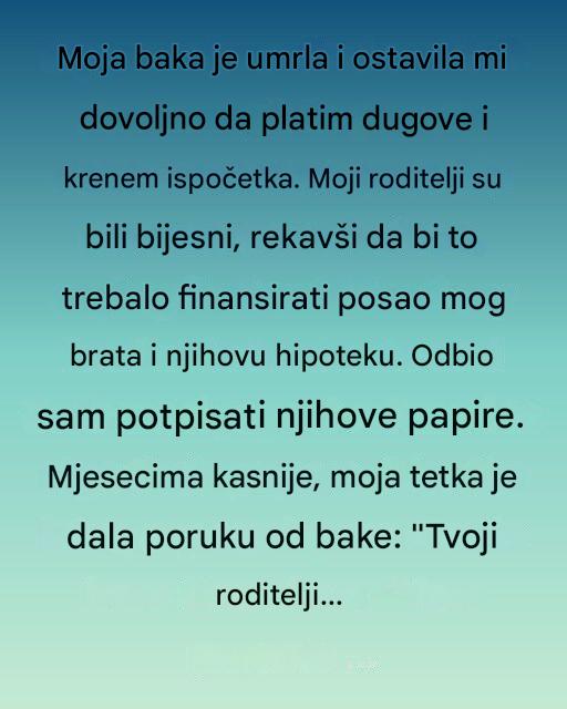 Nedugo zatim, mladić je dobio još jedno pismo od bake – originalnu oporuku u kojoj je ona jasno napisala: „Ako neko pokuša da menja narativ — ti ostani veran svom.“ Ovo pismo je bilo dokaz da je baka verovala u njega do kraja, i da mu je omogućila budućnost na način koji je smatrala pravednim. Umesto da se vraća u stare porodične konflikte, on je odlučio da ostane fokusiran na svoju budućnost i unutrašnji mir.