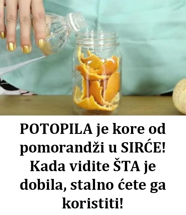 - Prvi korak u pripremi ovog sredstva za čišćenje je vrlo jednostavan: u staklenu teglu stavite korice pomorandži i prelijete ih sa jabukovim sirćetom. Ovu smjesu ostavite da odstoji pet dana na sobnoj temperaturi. Kroz nekoliko dana, korice pomorandži će upiti svu snagu sirćeta i stvoriti koncentrat koji će vam pomoći da očistite sve, od zagorjelih ostataka u rerni do masnih mrlja na kuhinjskim pločicama.