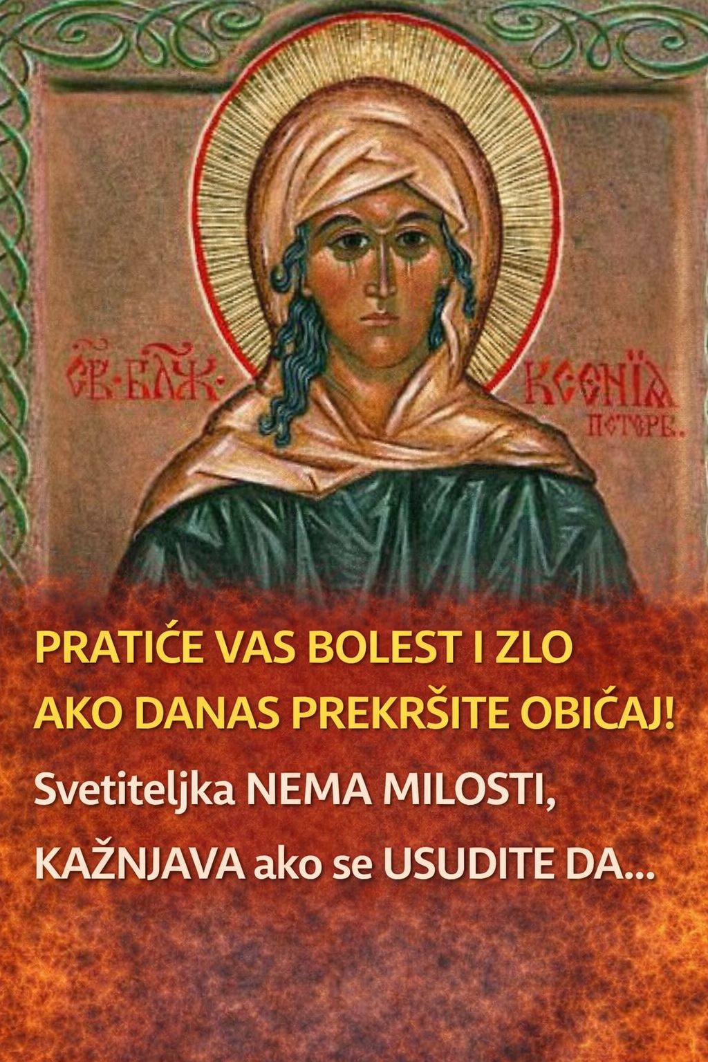 - Prema verovanjima, ako se na ovaj dan prekrše običaji, vernici će biti izloženi nevoljama i bolestima, jer Svetiteljka Ksenija, koja se smatra zaštitnicom svih onih u nevolji, strogo kažnjava one koji ne poštuju propisane rituale. Ovaj praznik se doživljava kao dan kada je potrebno očistiti srce i moliti se za spasenje svih onih koji se suočavaju sa teškoćama, bilo da je reč o porodičnim problemima, bolesti ili materijalnim poteškoćama.