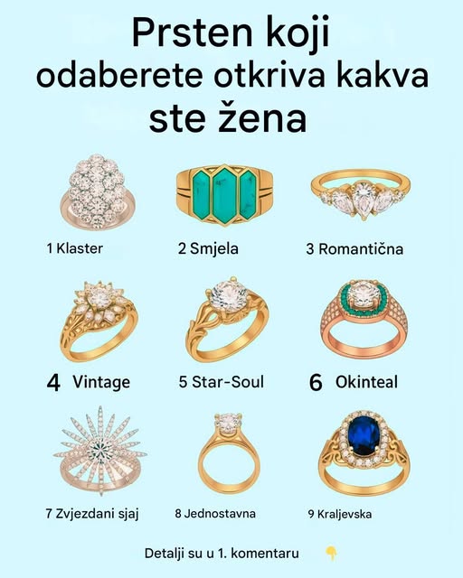 - Ako ste romantični sanjar, izbor krunskog prstena u obliku suze govori o vašoj dubokoj i potpunoj ljubavi. Ovaj prsten simbolizuje vašu sposobnost da verujete u ljude i gledate najbolje u njima, čak i kada svi drugi odustanu. Iako ste ponekad osetljivi, vaša saosećajnost je snaga koja čini vaše veze snažnim i stvarnim. Vaša emocionalna dubina čini vas osobom koja je sposobna da voli bez straha od bola.