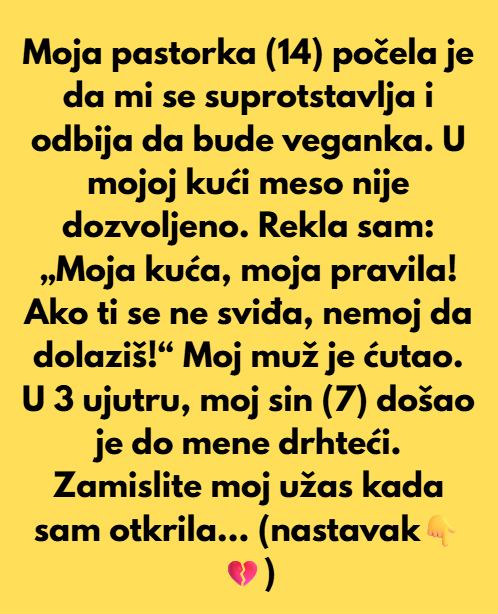 - Ali stvar je postala ozbiljna jedne noći, kada sam u tri ujutro, probudila zvuk otvaranja vrata. Moj sin, Marko (7), došao je do mene drhteći. “Mama, Jelena mi je rekla da ona više ne želi da bude ovde. Ona ne voli tvoje pravilo o hrani.” Srce mi je bilo kao da je zaronilo u stomak, a oči su mi bile pune suza. Zamišljala sam Jelenu kao osobu koja je želela samo da se oseća kao deo porodice, ali nisam mogla da shvatim zašto je bila toliko tvrdoglava u vezi sa stvarima koje nisu bile presudne za njen život.