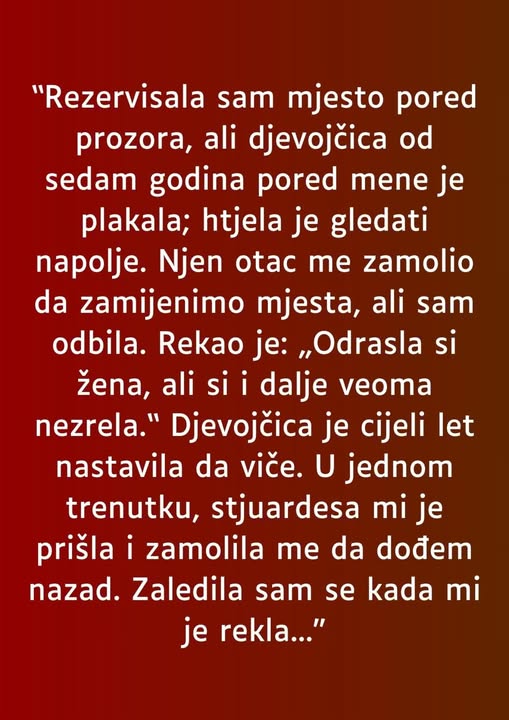 Rezervisala sam svoje mesto pored prozora, gde sam zamišljala da ću imati tišinu, prostora i potpunu privatnost. Ali, život je imao drugačije planove za mene.