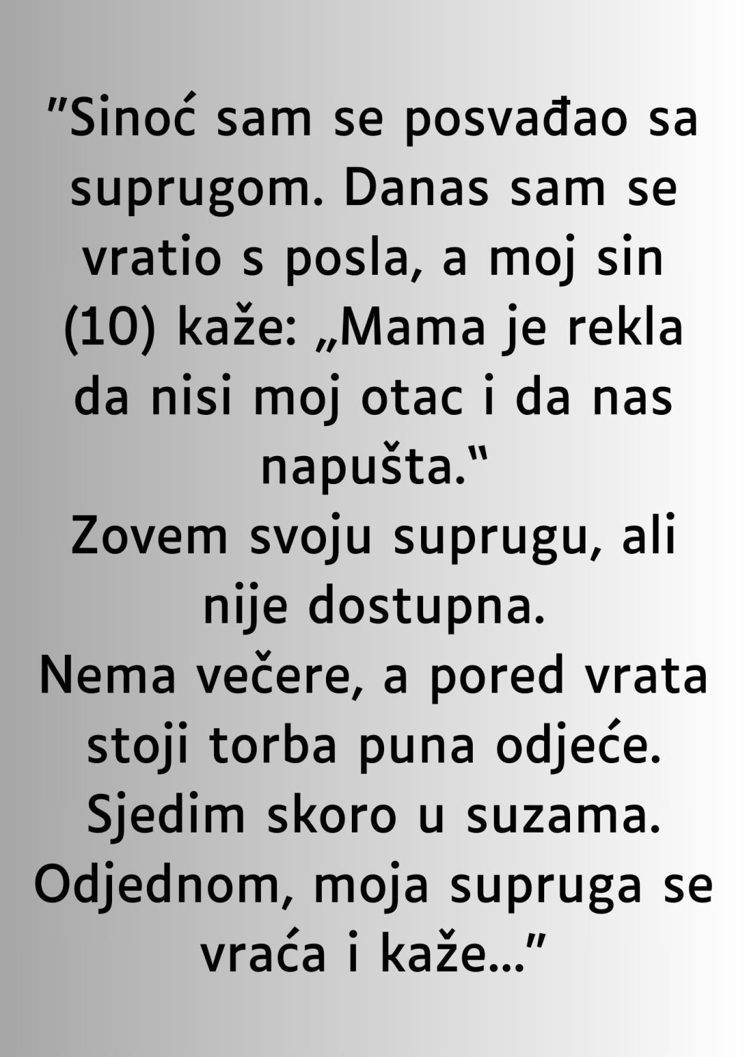 - Čovjek je doslovno osjetio kako mu se tlo pomjera pod nogama. Nije odmah shvatio šta je dijete reklo. Riječi su mu zvučale izlomljeno, nestvarno, kao da ne pripadaju stvarnom životu. Kada su mu se konačno posložile, osjetio je ledenu prazninu u grudima.