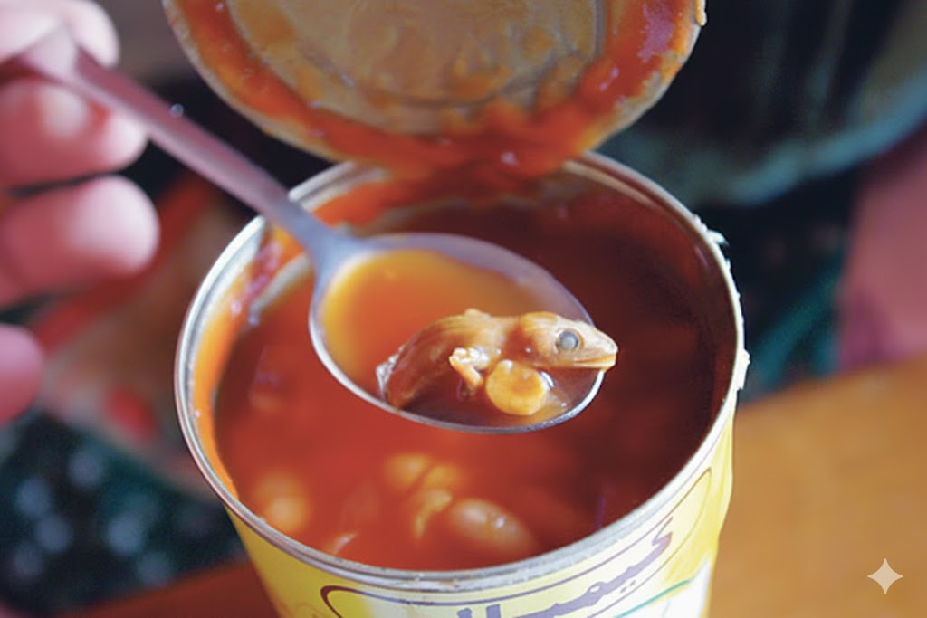 No, kad sam zagrabio žlicom i podigao prvi zalogaj, nešto mi je zapelo za oko. Na samom vrhu konzerve, među grahom, uočio sam nešto što nije pripadalo tom obroku. To nije bila obična kvrga ili komadić graha – nešto je virilo iznutra, nešto što nije imalo nikakve veze s hranom. Podigao sam žlicu i usmjerio pažnju na to „nešto“. Srce mi je stalo kad sam shvatio da je to… pola guštera!