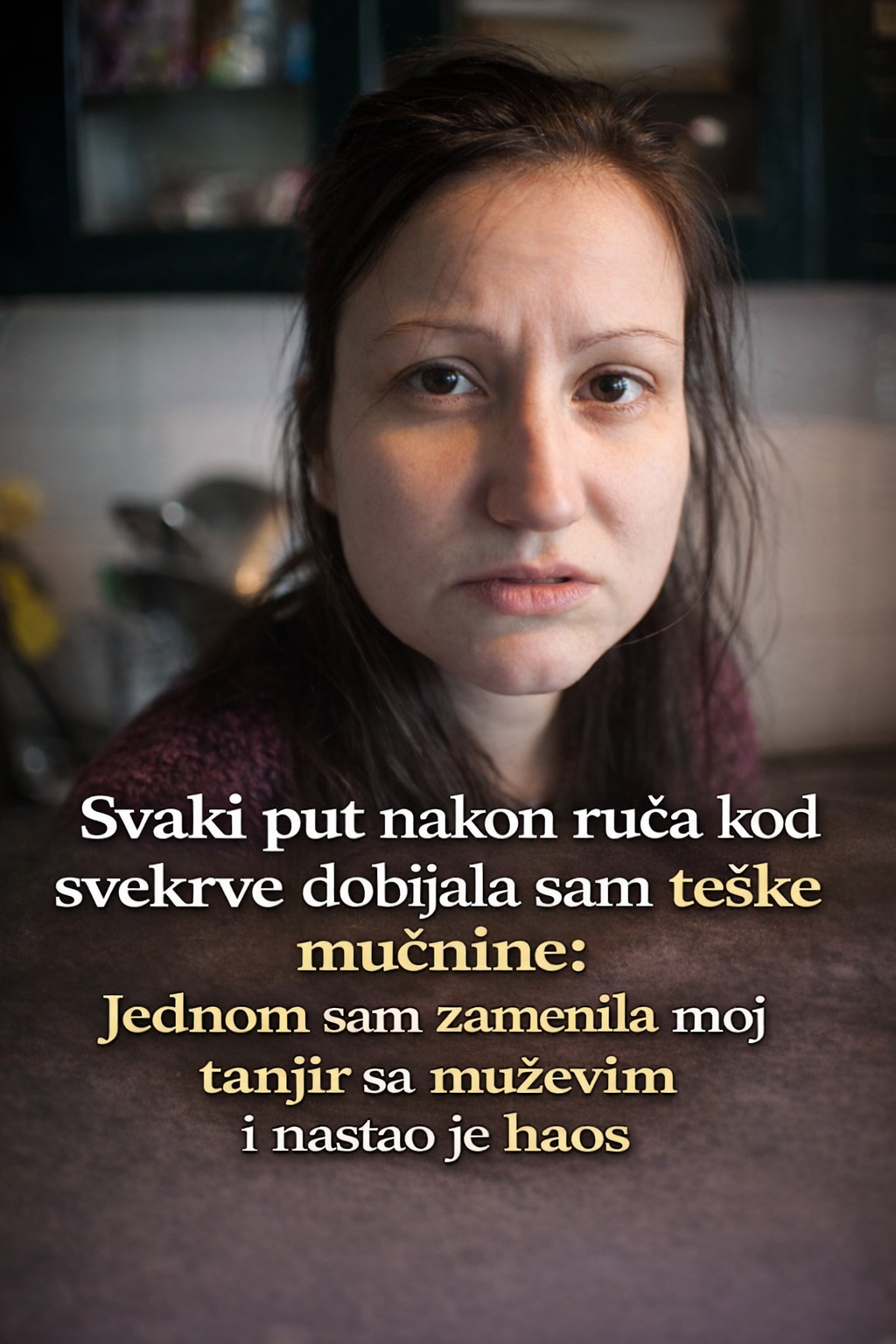 Svekrva je bila osoba s kojom je imala zategnute odnose već godinama. Iako su svi pokušavali da zadrže mirne odnose zbog porodice, žena je osećala napetost i neprijateljstvo svaki put kada bi bila sama sa svekrvom. Mnoge žene se sigurno mogu poistovetiti s ovom situacijom, jer su odnosi sa svekrvama često puni nesigurnosti i skrivenih tenzija. Iako su svi prisustvovali porodičnim ručkovima, ona nije imala nijednu pravu priliku da se oseti dobrodošlo ili da se opusti u prisustvu svekrve. Iako je muž smatrao da ona preteruje, svaki obrok koji je bio kod svekrve pretvarao se u noćnu moru.