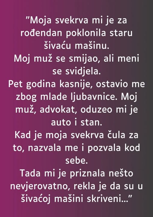 Otvorila sam kutiju i ostala bez riječi. Unutra je bila stara šivaća mašina. Vidjelo se da je korištena godinama. Na nekim dijelovima je bila izlizana, a kabl je bio požutio. Svekrva se ponosno nasmiješila i rekla kako je to „prava stvar za jednu snahu“ i kako je ona sličnom mašinom hranila porodicu.