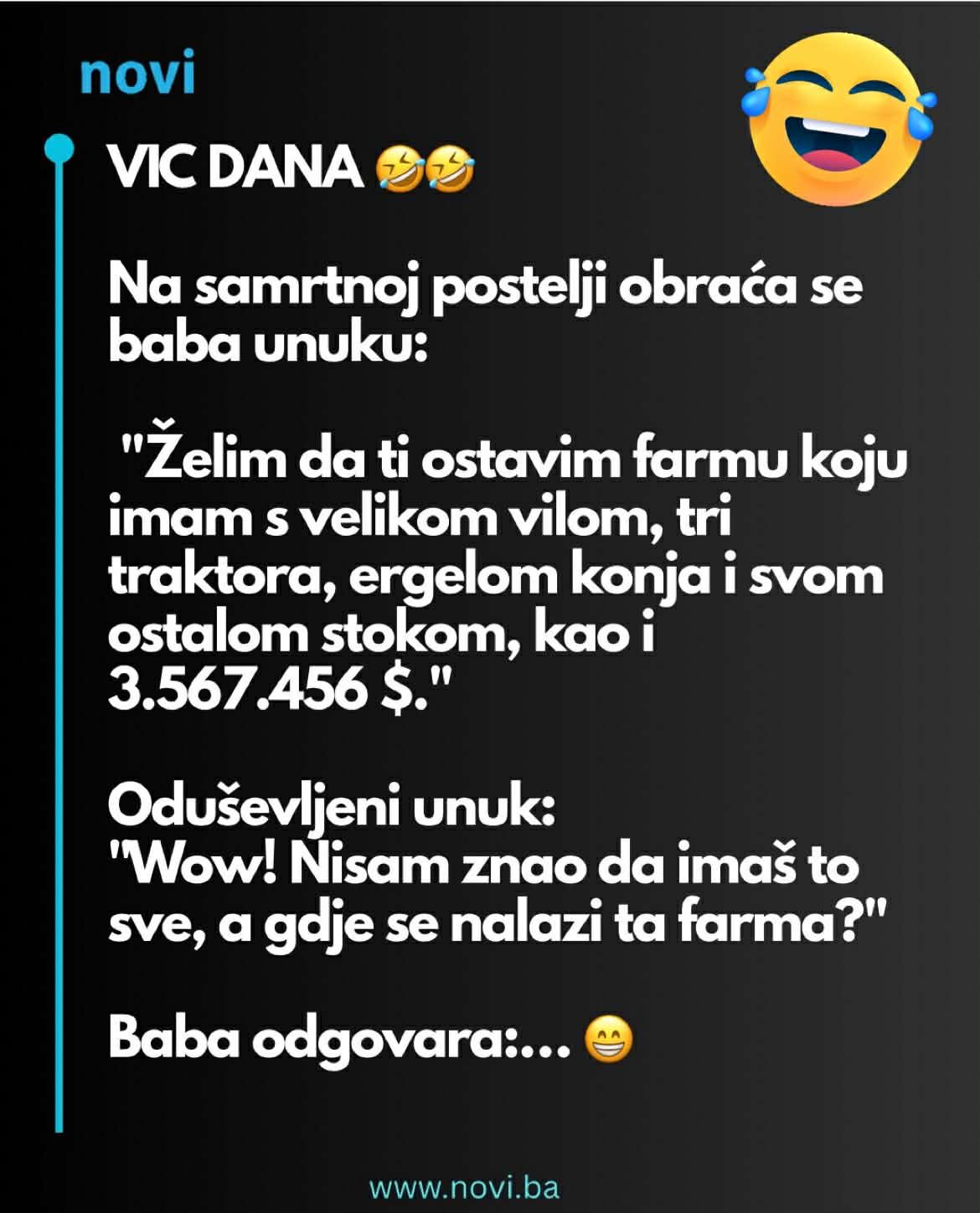 Unuk je bio zatečen. Nikada nije znao da njegova baka poseduje toliku imovinu. Oči su mu bile širom otvorene od iznenađenja. „Bako,“ upitao je sa nevericom, „a gde se nalazi ta farma?“