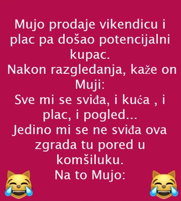 Smeh i humor mogu da nas vode kroz život, pomažući nam da se nosimo sa stresom i stvaramo pozitivne odnose s drugima. Vic o Muji i njegovoj prodaji vikendice nije samo smešan, već i poučan, jer nam pokazuje da humor može biti korisno oružje u pregovorima, prodaji i svakodnevnim situacijama. Dakle, sledeći put kada naiđete na neku izazovnu situaciju, setite se da ponekad dobar smeh može da bude najbolji način da izbegnete stres i stvorite prijateljsku atmosferu.