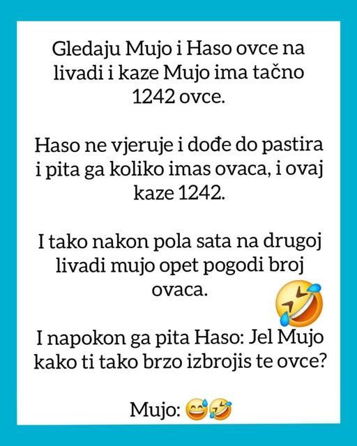Zamislite samo trenutak kada se Mujo i Haso smeju zbog ove sitne nespretne situacije. To je trenutak koji spaja ljude, bez obzira na to šta rade ili kroz šta prolaze. Humor je univerzalni jezik koji povezuje ljude. Bez obzira na to što su Mujo i Haso u početku bili zabrinuti zbog broja ovaca, kroz humor su sve preokrenuli i našli način da uživaju u jednostavnoj situaciji.