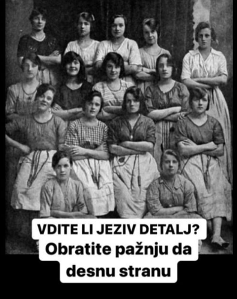 - Fotografija prikazuje petnaest radnica koje stoje zajedno, prekriženih ruku, što je tipičan način poziranja za takve povijesne snimke. Na prvi pogled, ništa ne ukazuje na neobičnost, sve dok se ne pogleda detaljnije. Na desnoj strani slike, među tim radnicama, pojavljuje se ruka koja je postavljena na ramenu jedne od žena, dok nijedna druga osoba ne pokazuje sličnu gestu. Ovaj detalj odmah izaziva osjećaj nelagode, jer nitko na slici ne reagira na ruku koja nije poveziva s nijednom od prisutnih žena. Pitanje je: čija je ta ruka? Zbog ove neobjašnjene pojave, fotografija je postala predmet mnogih spekulacija, a misterij oko nje traje više od stotinu godina.